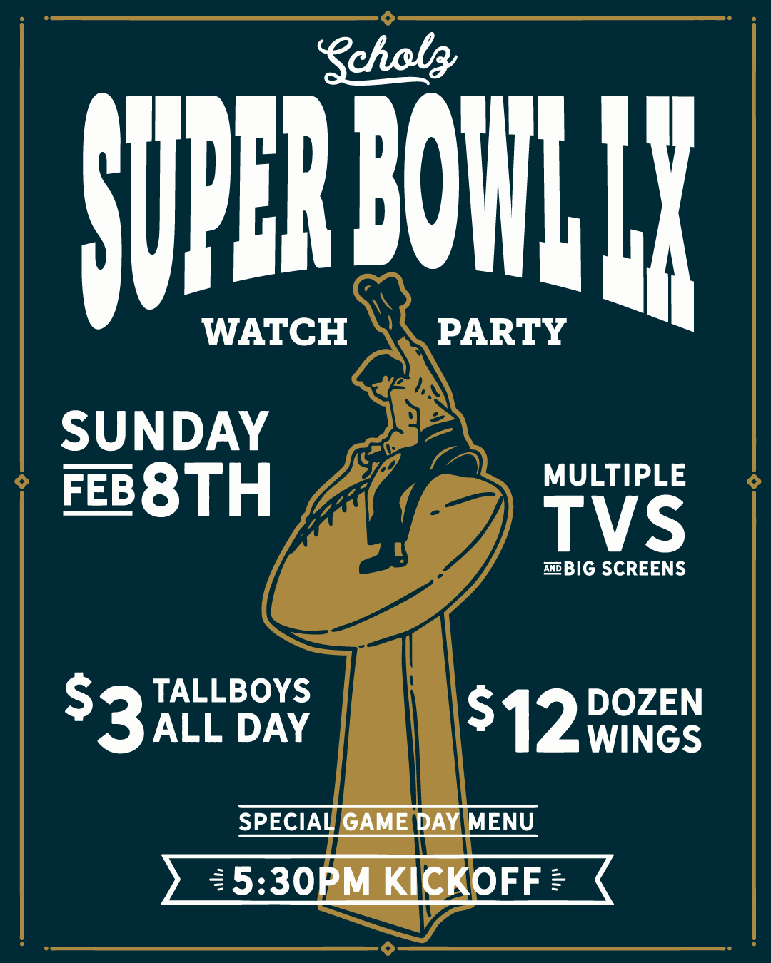 We will be serving our abbreviated food menu, above, Scholz Counter Service starting at 3:00pm. Open til end of game.